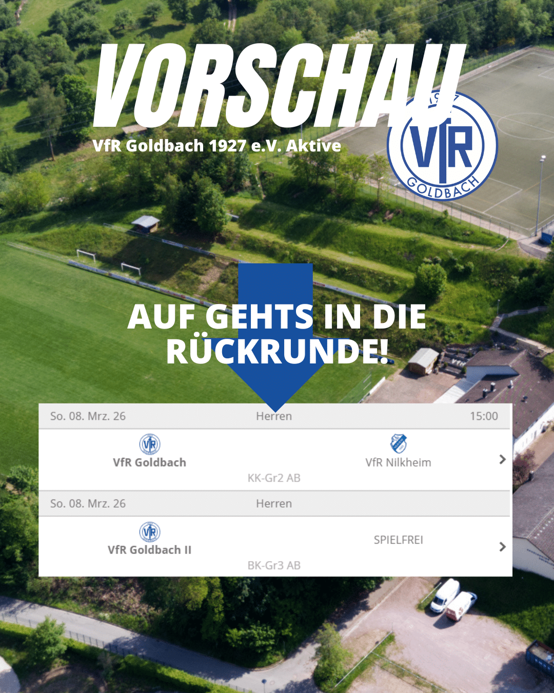 Schluss mit Vorbereitung und Schluss mit Winterpause. Am Sonntag gehts wieder los, ab 15 Uhr spielt unsere VfR I gegen den VfR Nilkheim. Wir freuen uns über zahlreiche Besucher.